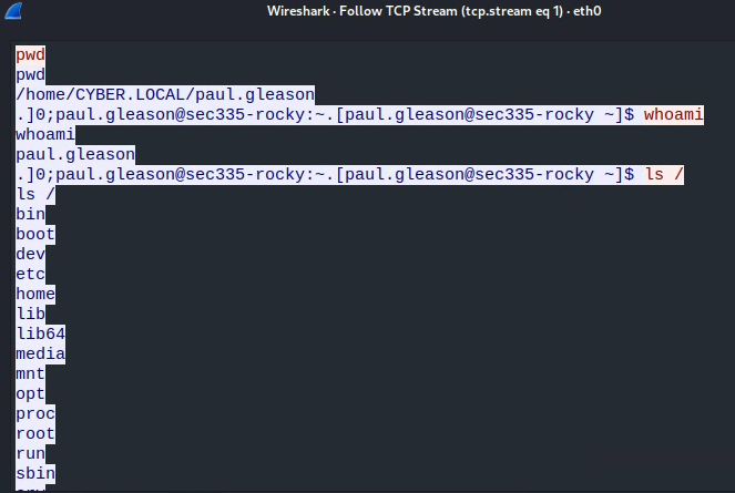 ### **Deliverable 1. Run wireshark, create a capture filter on 4449/tcp and capture a command or two entered through the nc session. Provide a screenshot showing the followed tcp stream, similar to the screenshot below.**